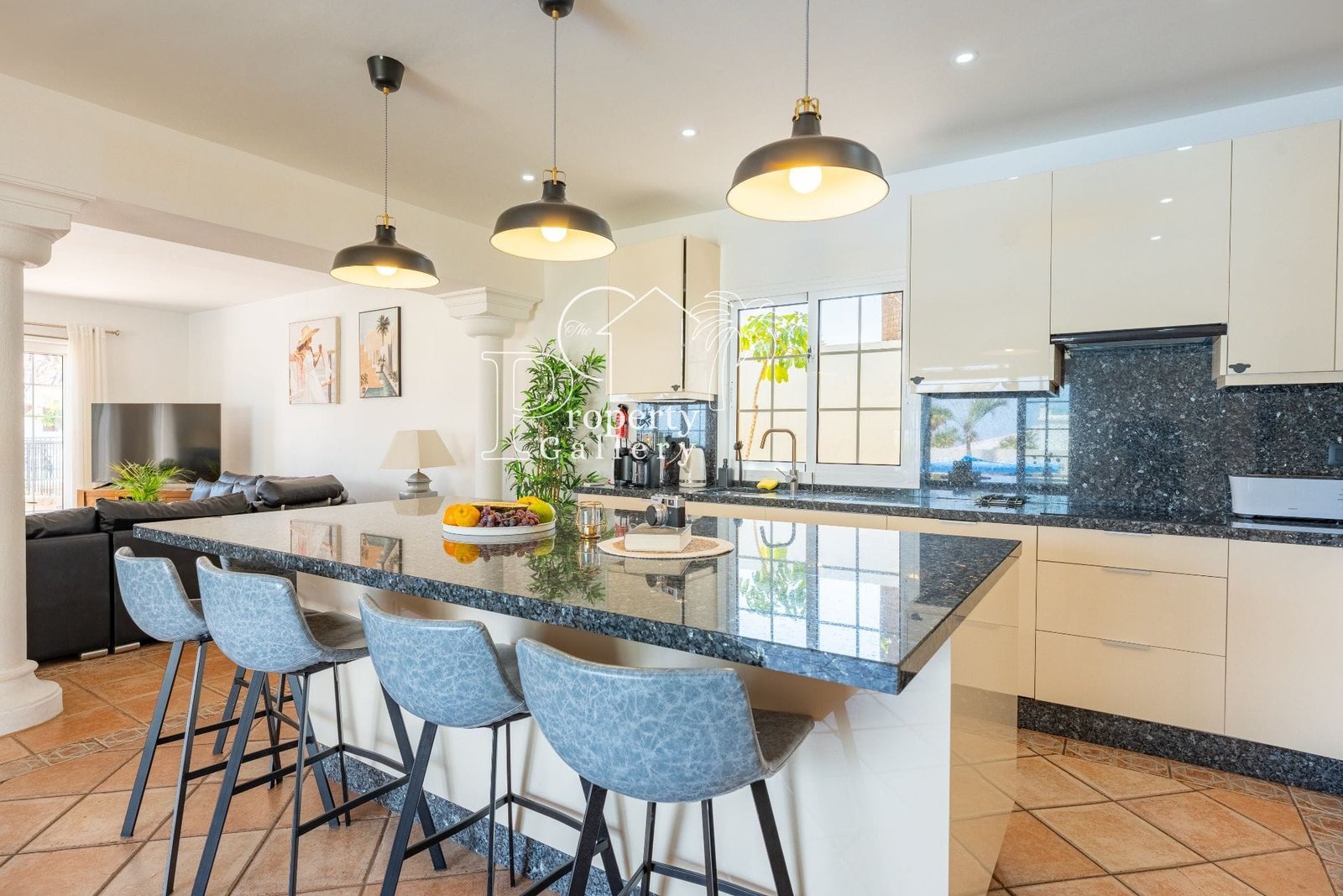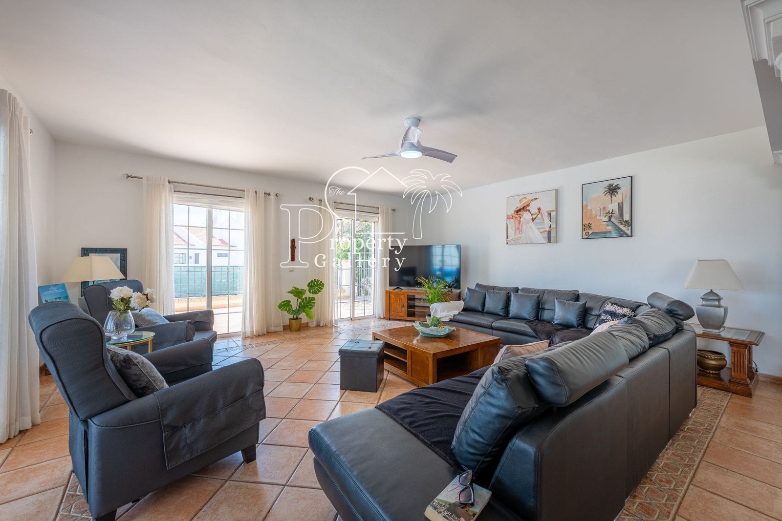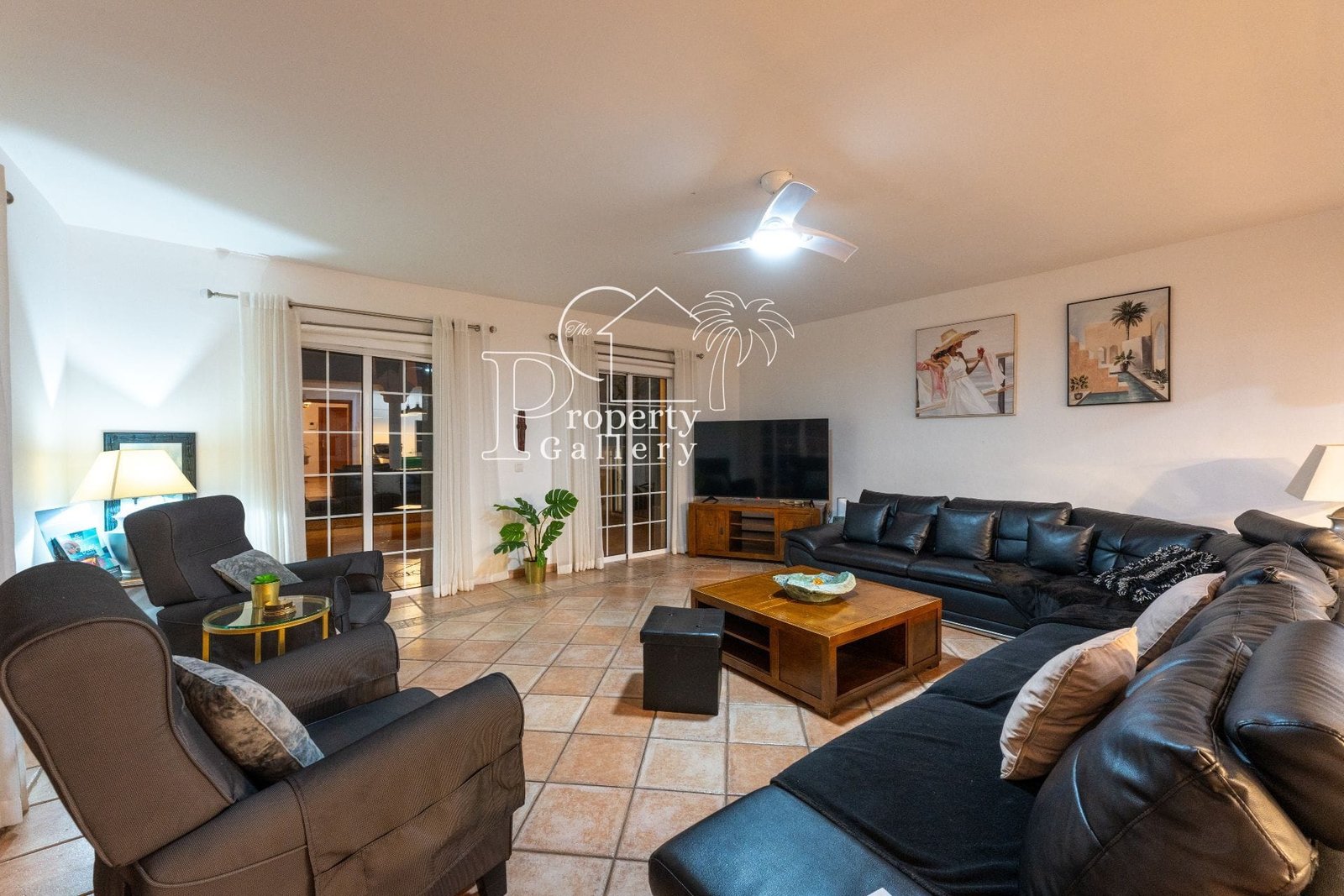 The villa features open, sun-filled living areas with high ceilings, large windows, and doors that open onto terraces and gardens. A modern kitchen, multiple lounges, and air conditioning throughout provide practical, comfortable living for both everyday life and entertaining.